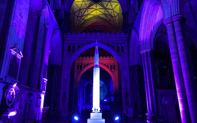 On the West Front, visitors are asked to contemplate the vastness of space and the fragility of our small blue planet. Entering the Cloisters they walk into an ‘other wordly’ galaxy of planets and zodiacs.Moving on, a 4m high space rocket reaches to the sky in the the South Transept.